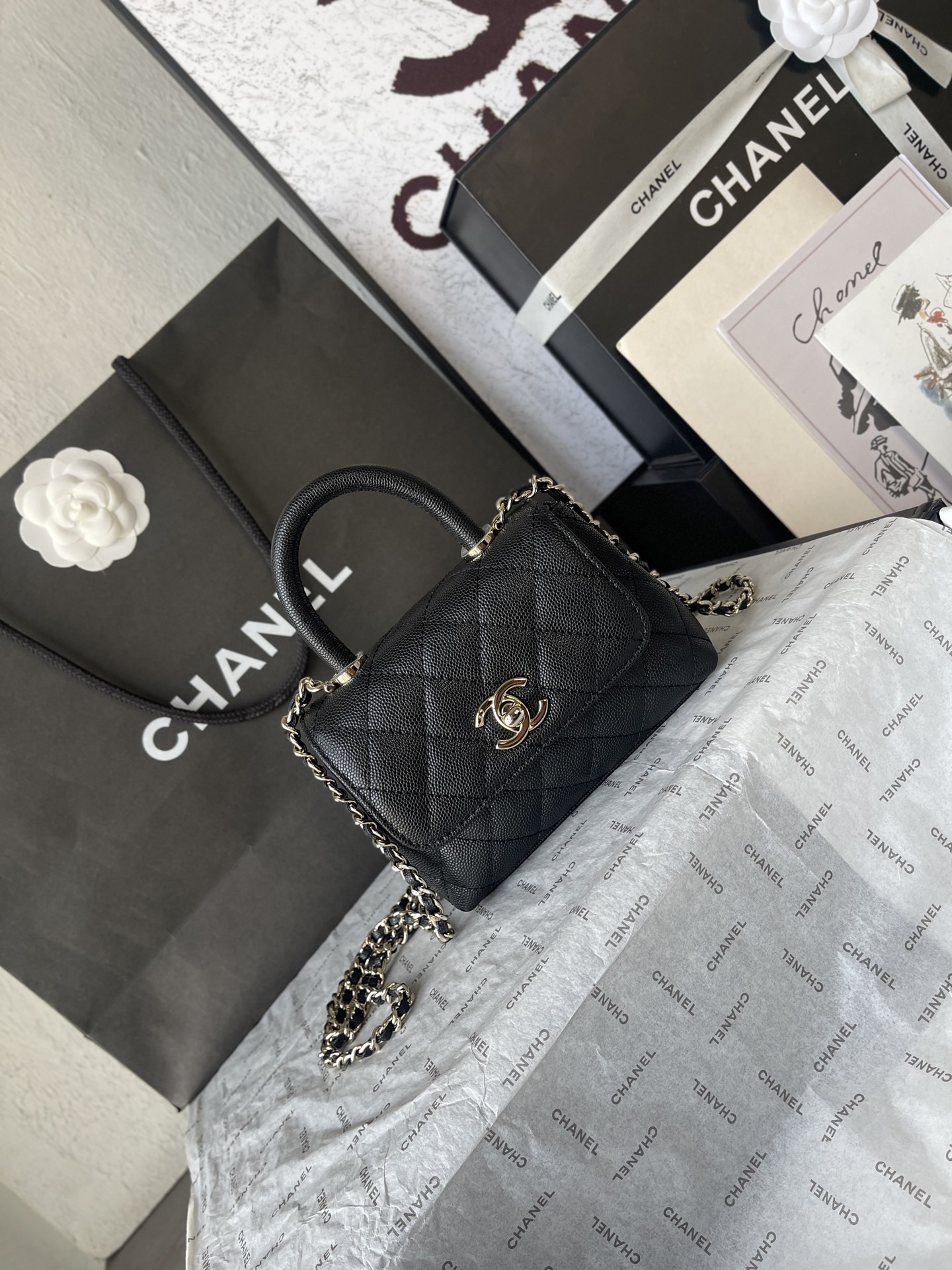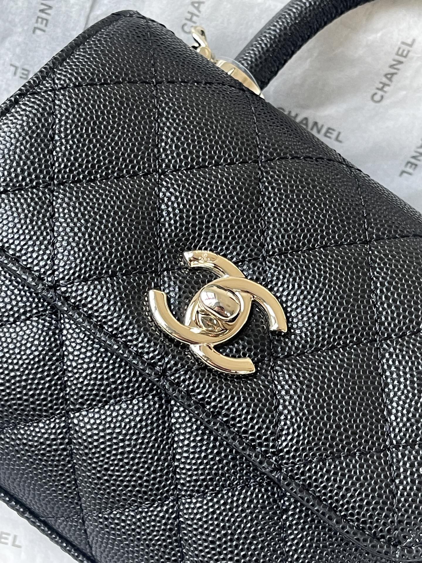 4244 Piped Leather Interior, lined with lambskin. 𝑐𝑜𝑐𝑜 ℎ𝑎𝑛𝑑𝑙𝑒 Flap Top Handle Bag — the classic coco handle, almost a showstopper 🃏. Now launched in this 𝑠𝑖𝑧𝑒 ❣, even softer and more adorable — completely obsessed!!! Wristlet style with ball-grained calfskin, paired with ball-grained leather. 𝟏𝟒𝑘 light gold clasp. AS4244.