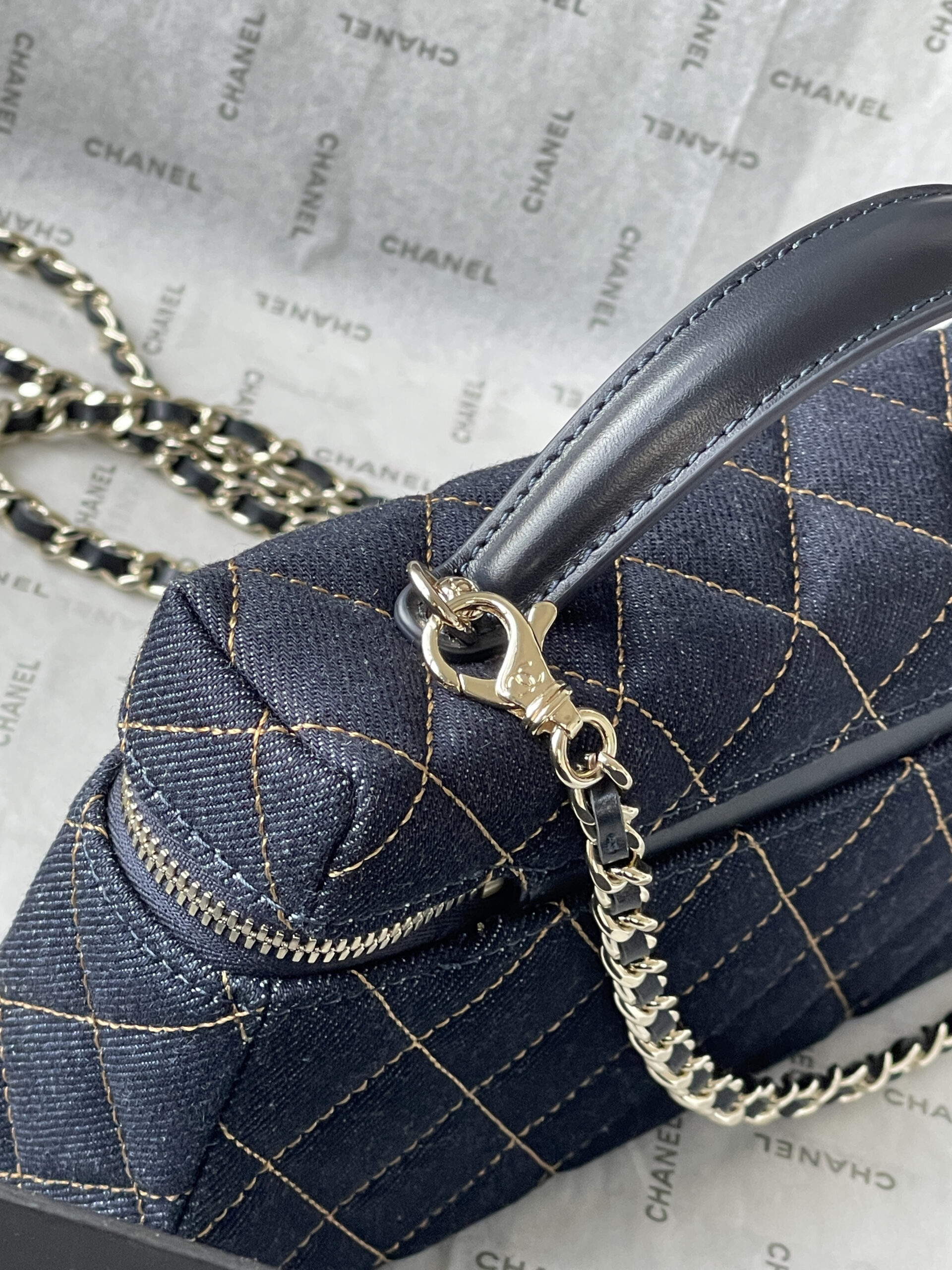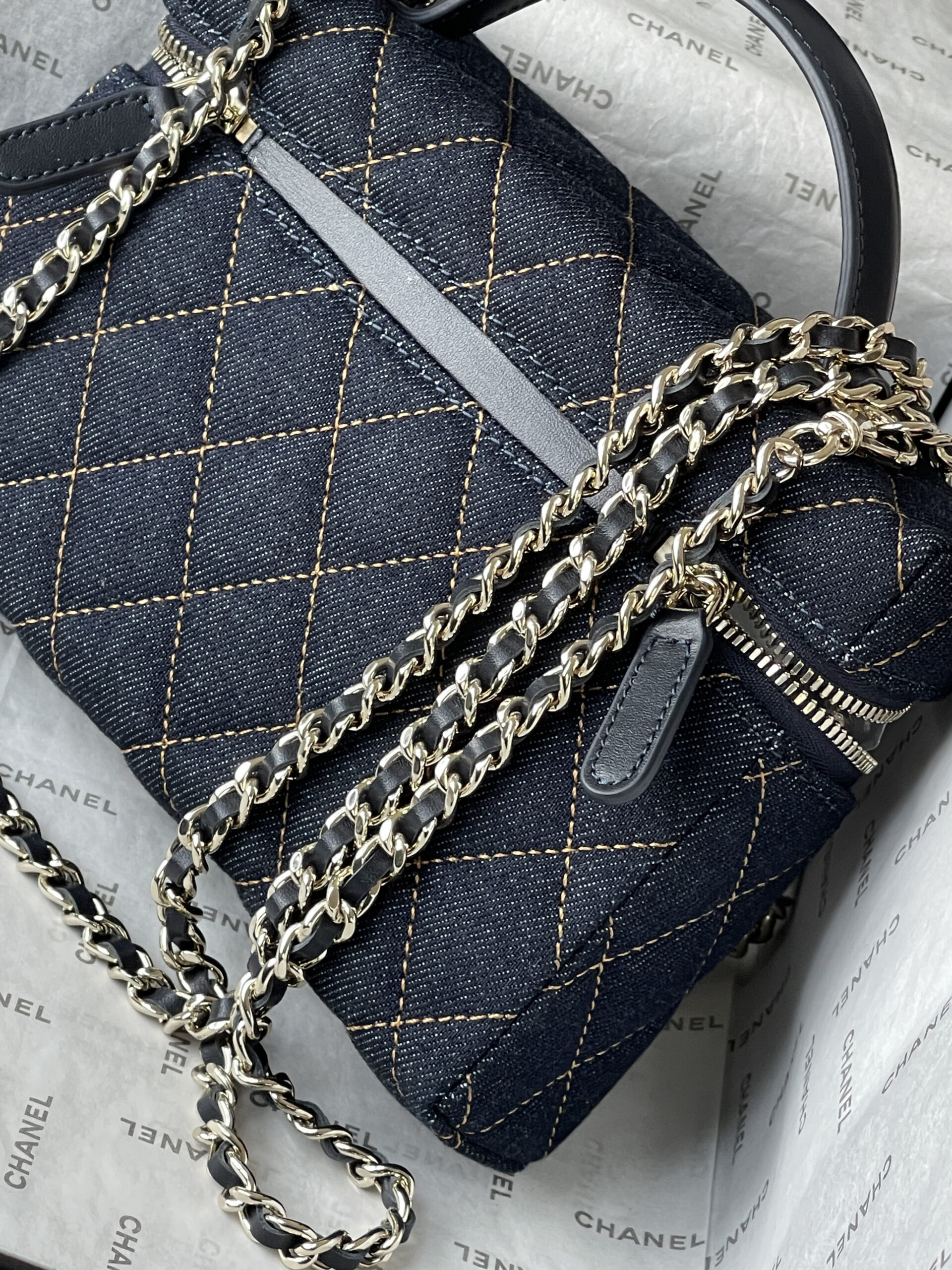 Chanel 🚩🚩🚩 26P Denim LP Bag, AP4385 🤩🤩 Dark denim fabric + quilted stitching, full of vintage modern vibes! Metal chain & leather shoulder strap, can be carried by hand or crossbody, super versatile. Double-C Logo on the front + zipper design, exquisite details with great texture. The size is just right, can hold daily essentials for both commuting and casual wear. Lightweight yet stylish, a super popular piece from the collection, a must-have for denim lovers!