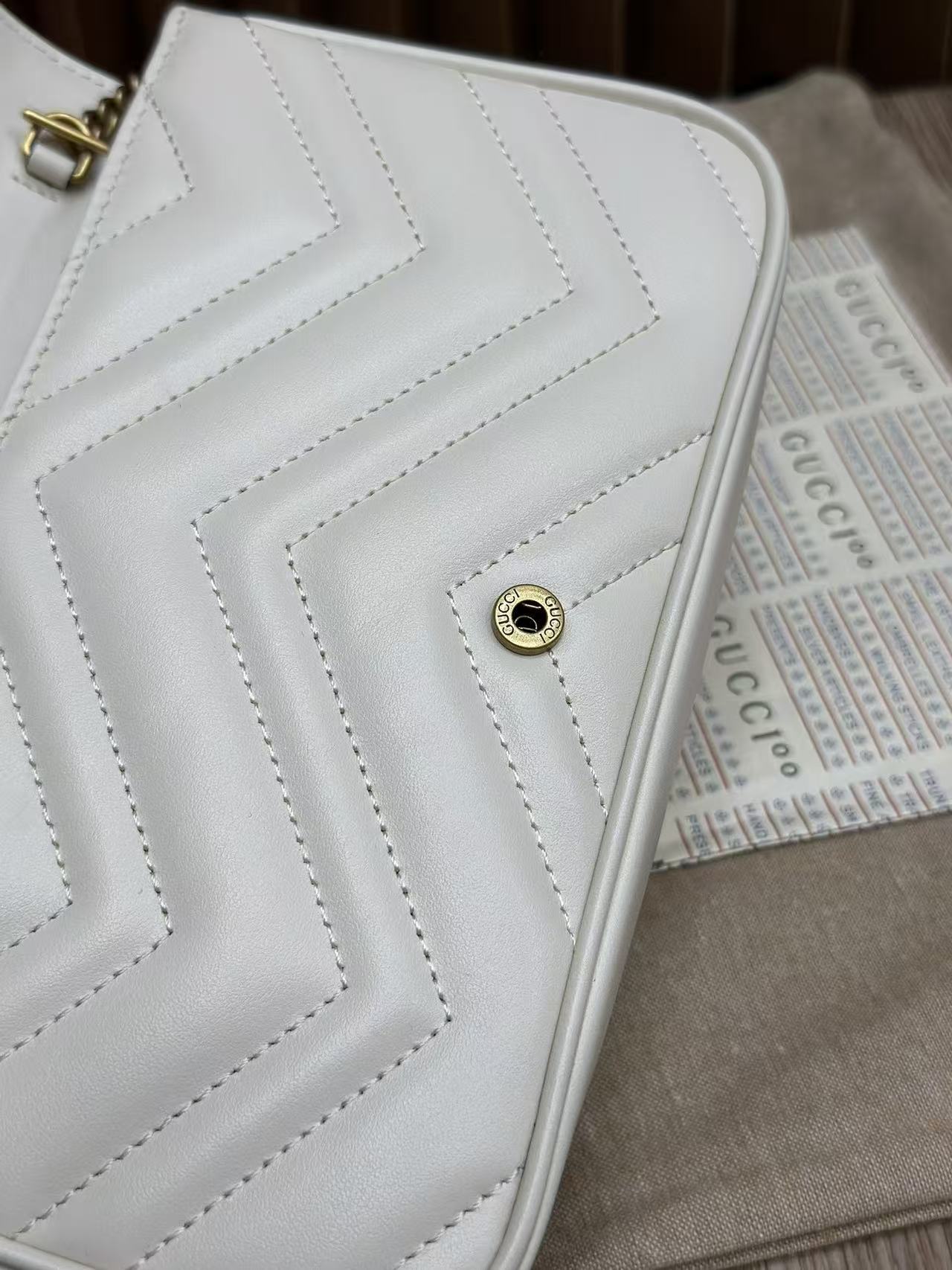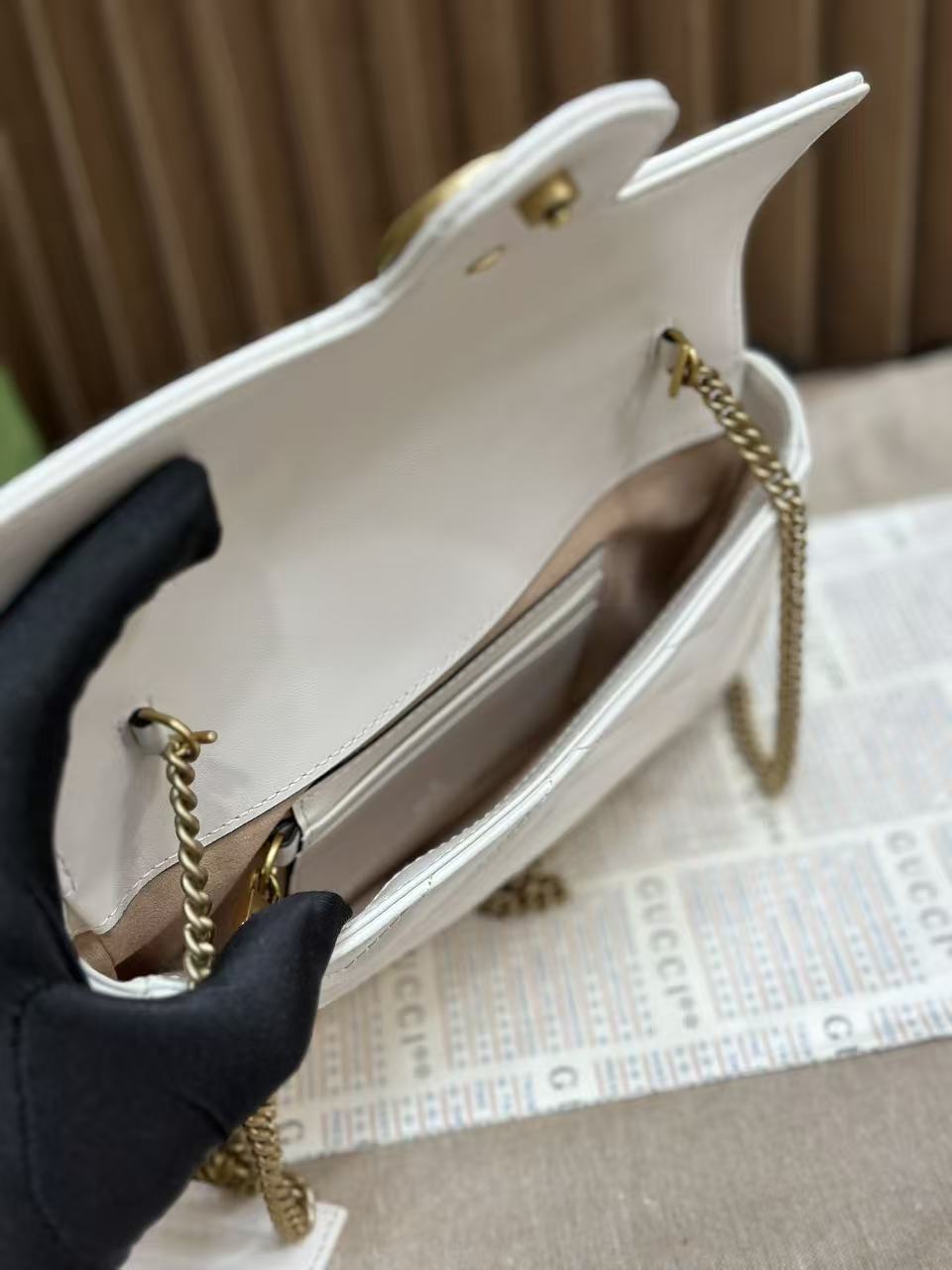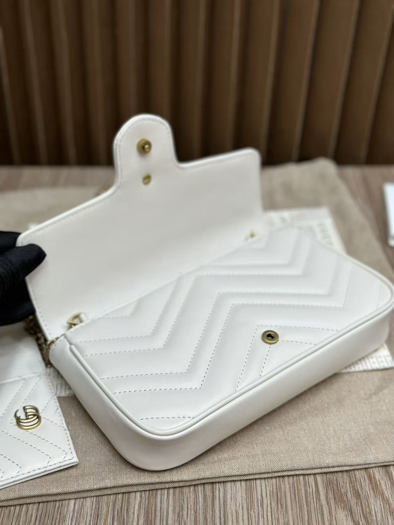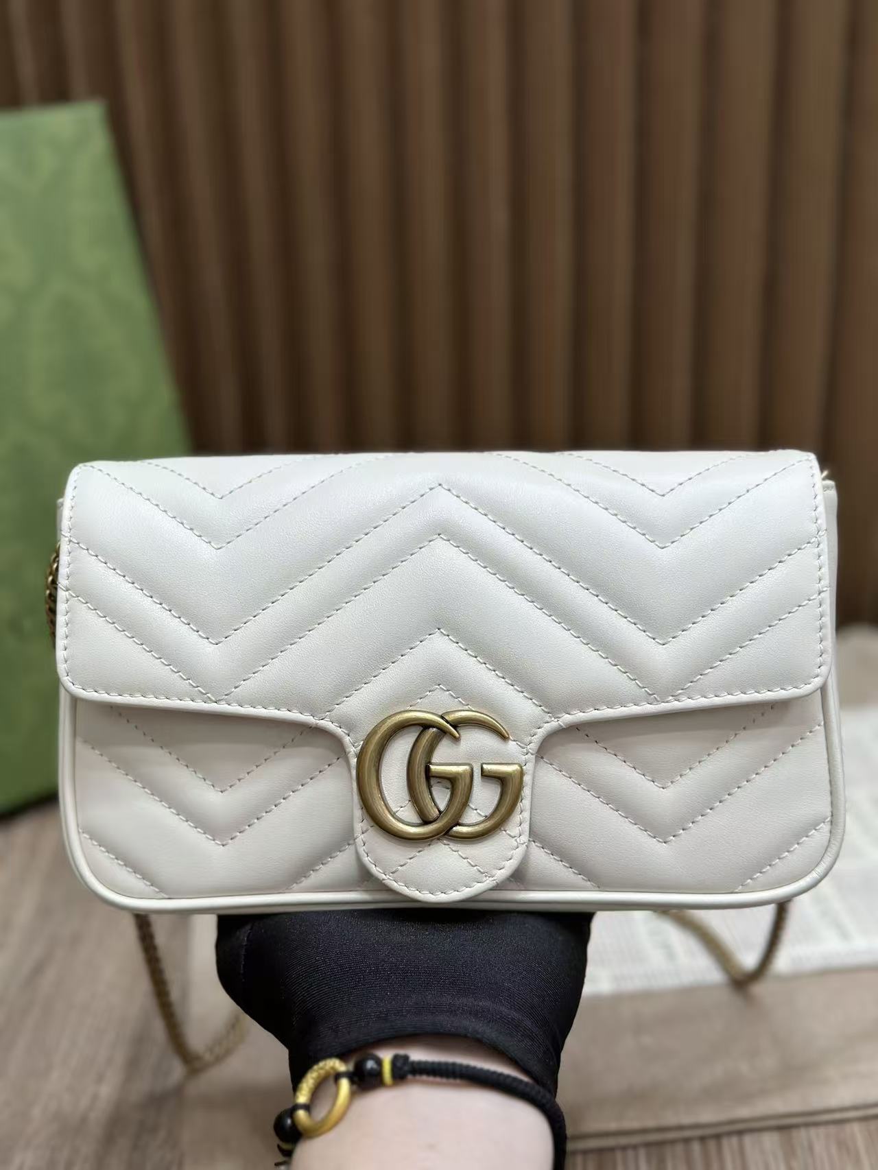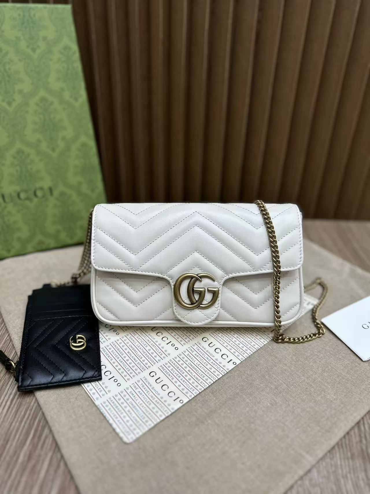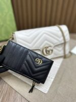 🔥 Gucci The Double G hardware design infuses traditional essence into the brand’s modern style, bringing timeless pieces to your wardrobe. This mini chain card holder comes with a chain shoulder strap, crafted from signature black quilted V-pattern leather, and features a detachable white contrast leather card slot inside!
