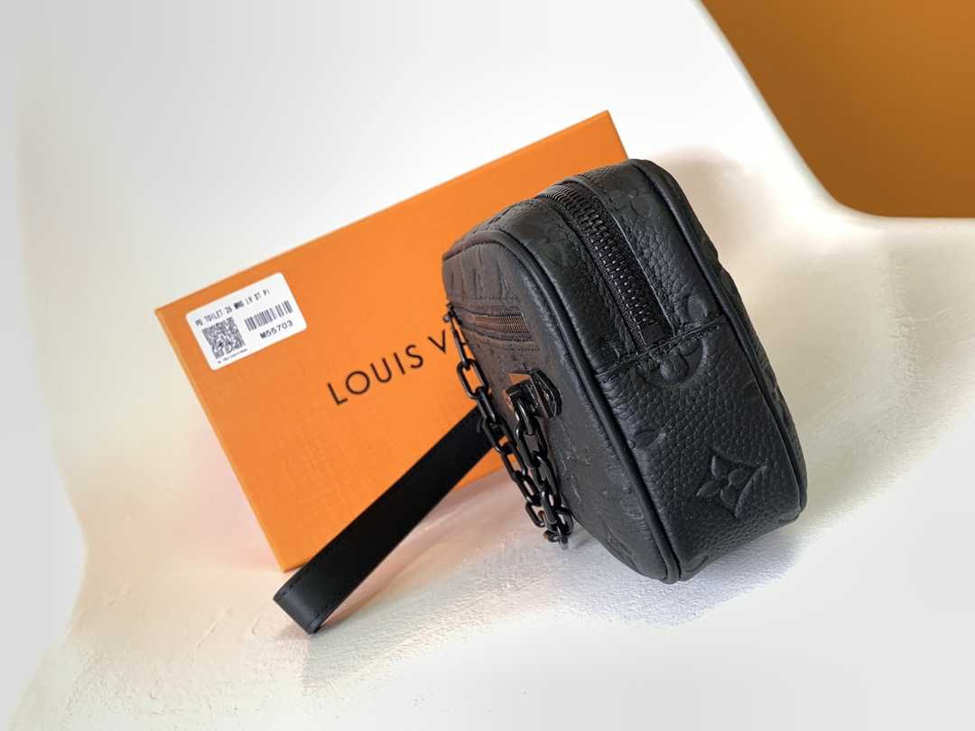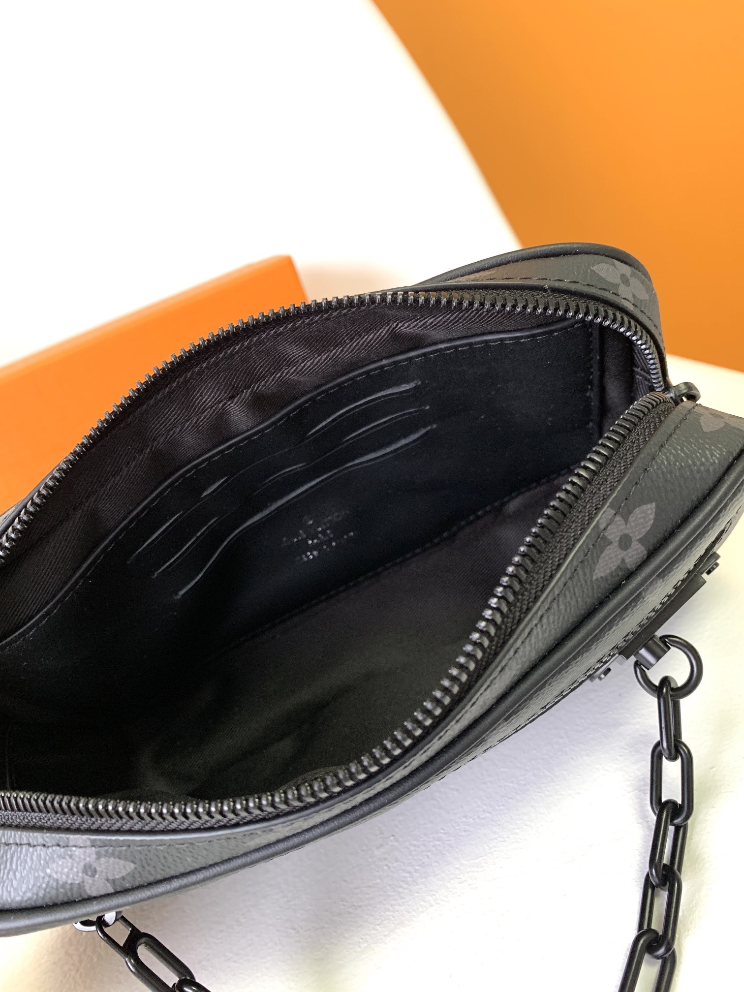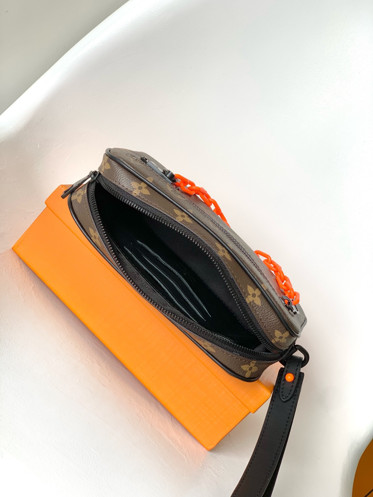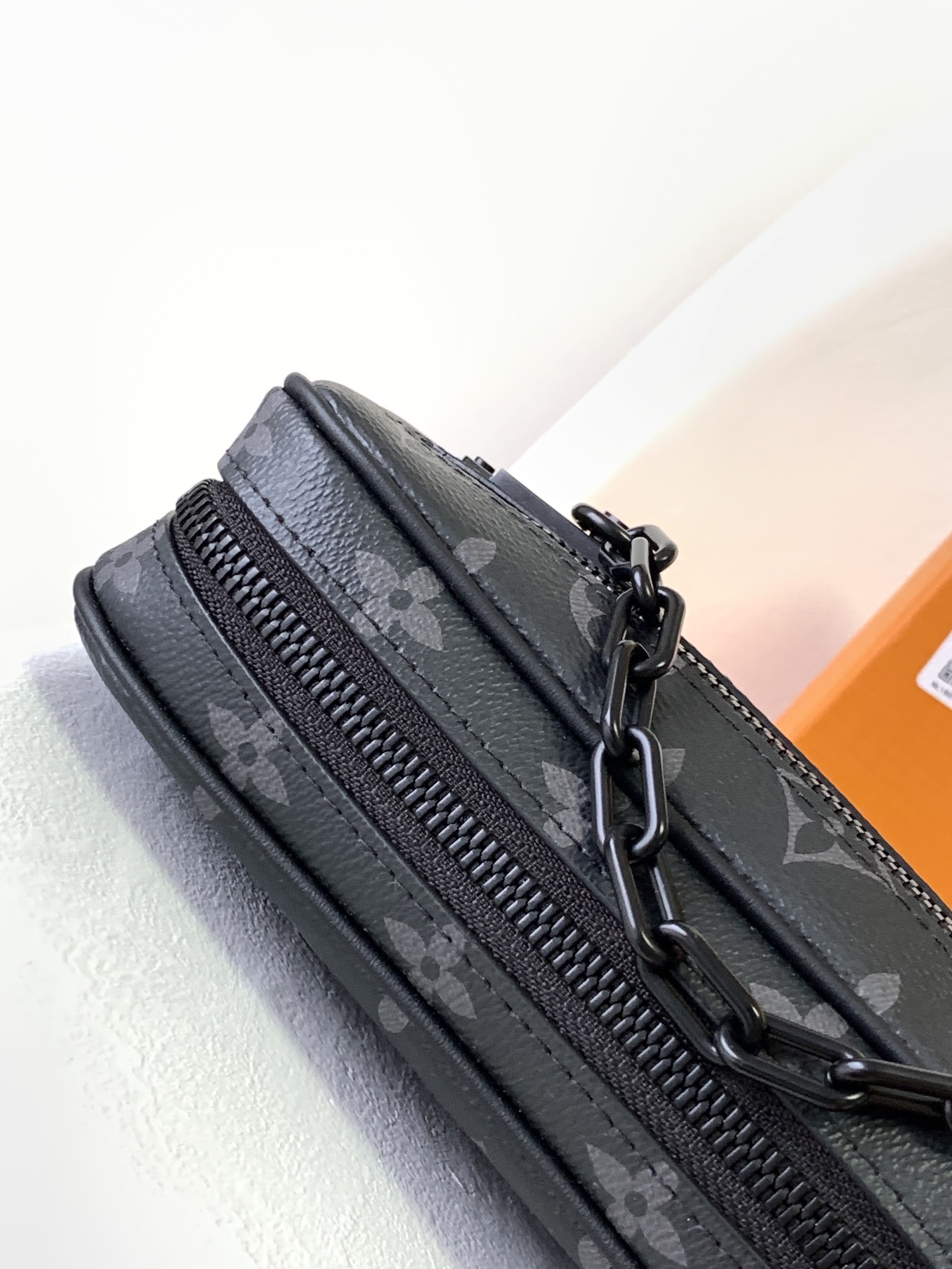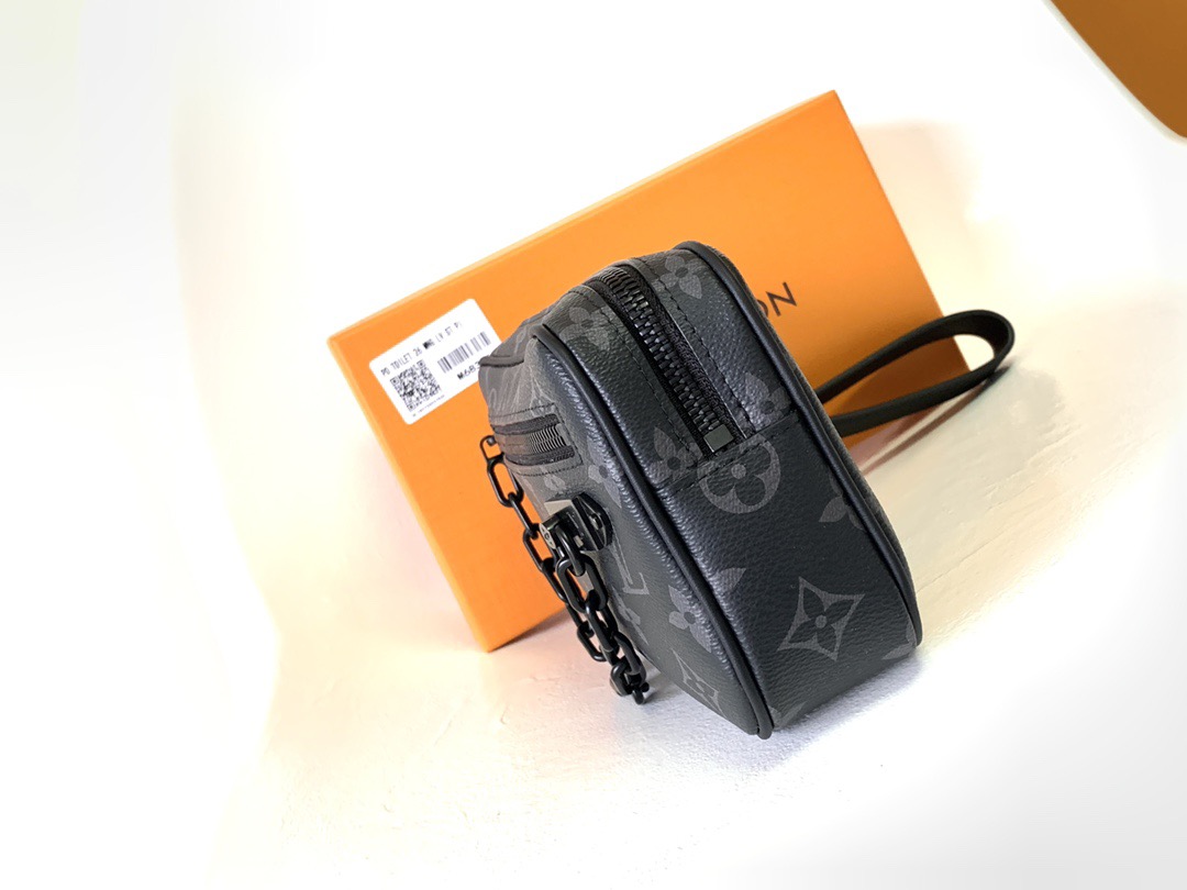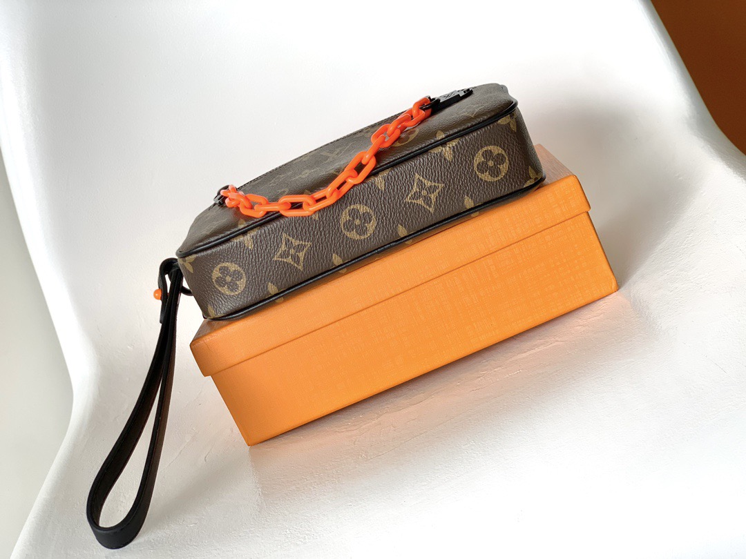 This Pochette Volga clutch designed by Virgil Abloh is unveiled at the Spring Summer show.Monogram Eclipse canvas with a slim chain attached to the front zip pocket and detachable wristlet.Easily switches between clutch and wallet.