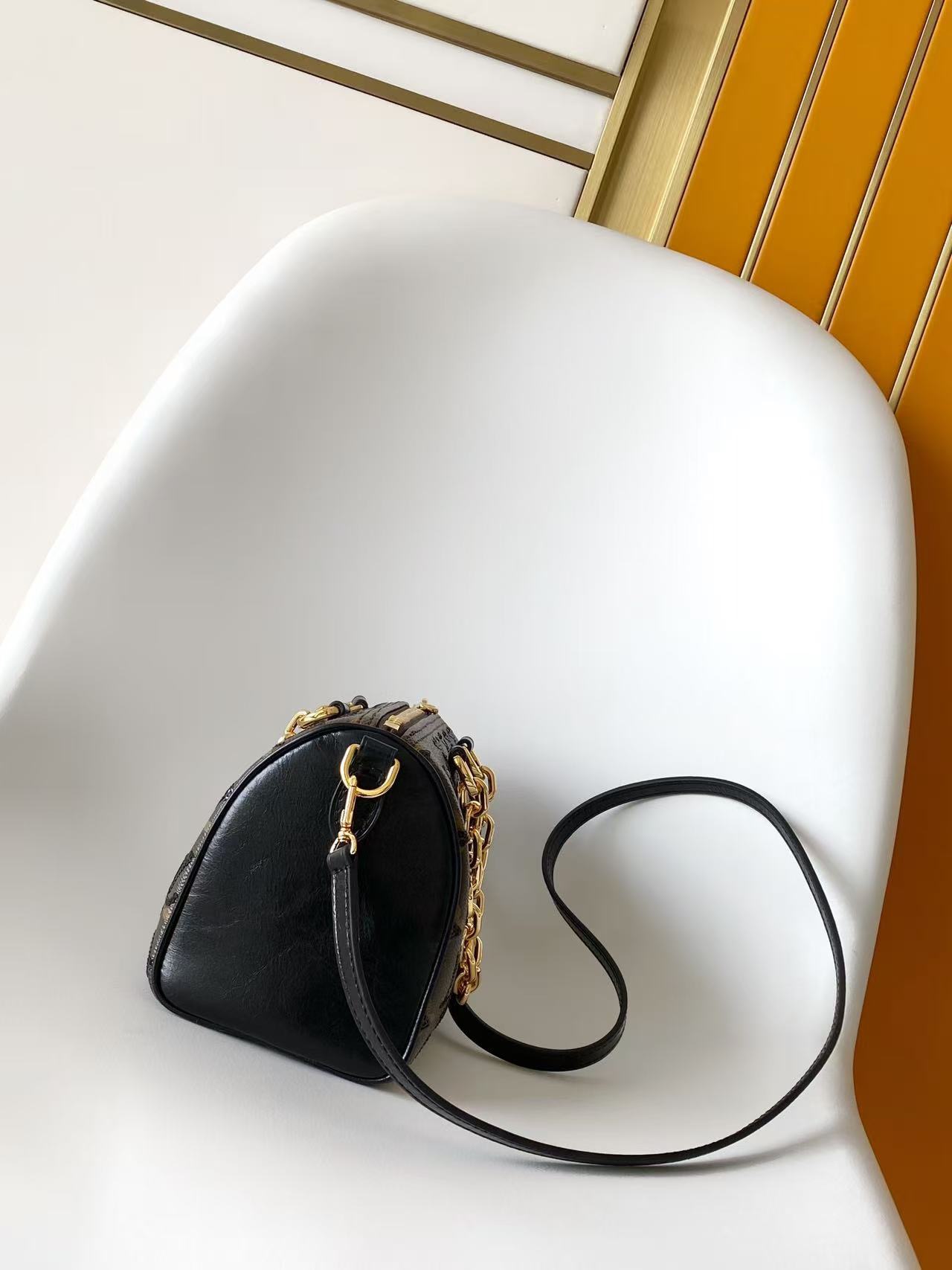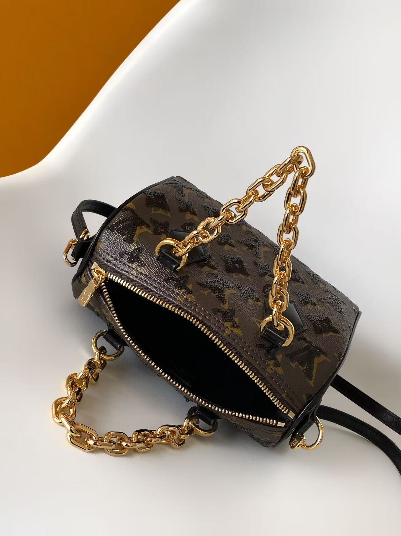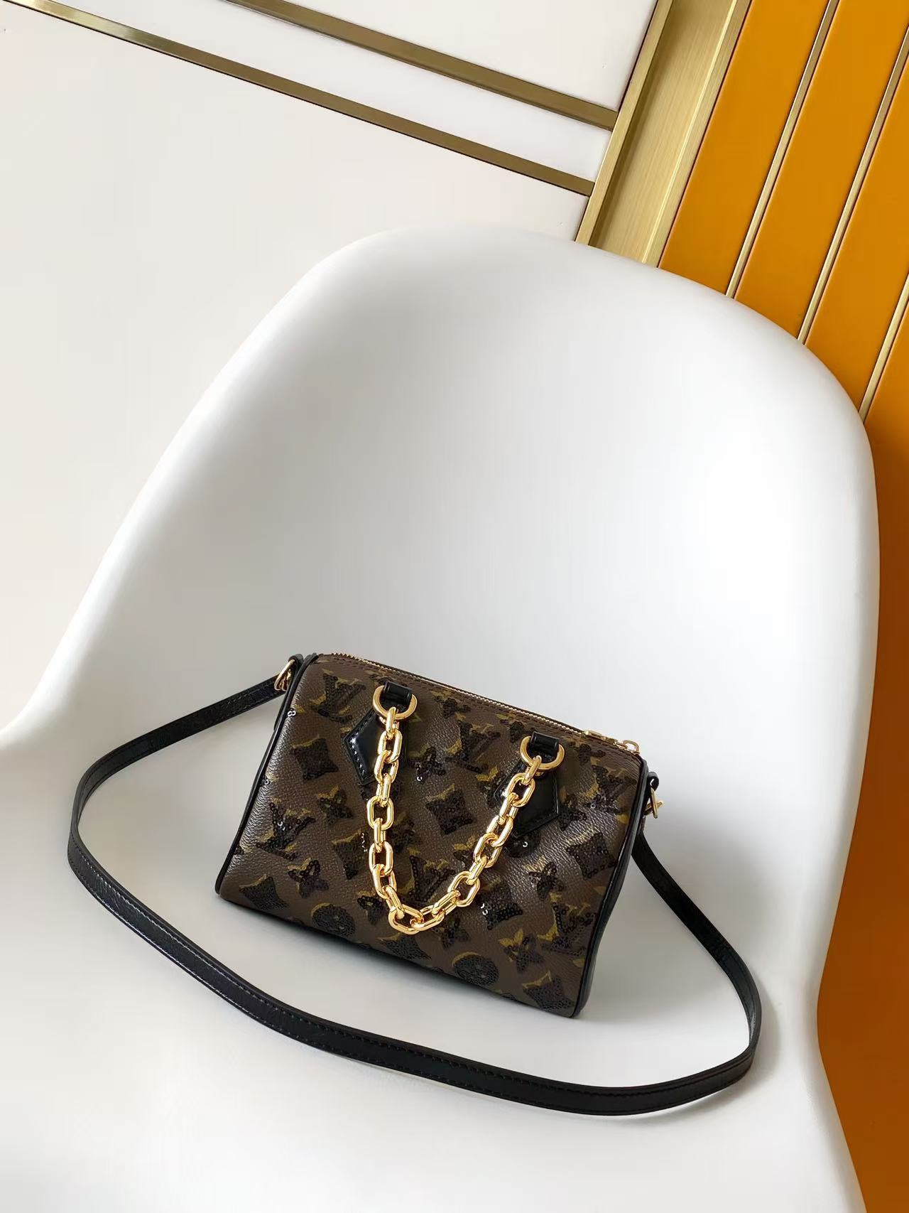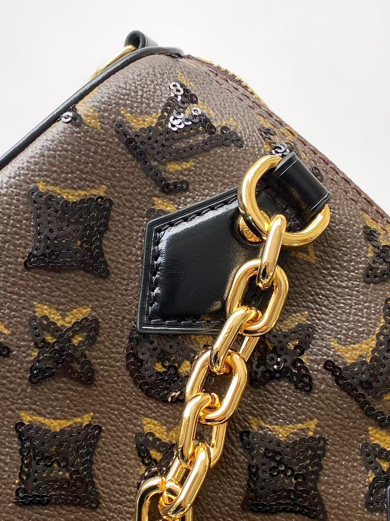 This Monogram Sequins edition of the Speedy Bandoulière 20 bag is from the LV Ski collection. It features sparkling sequins on the canvas body, creating a deep light and shadow effect like an eclipse. The striking chunky chain elevates the elegant style, and the leather strap allows for crossbody wear, making it an ideal choice for evening occasions.