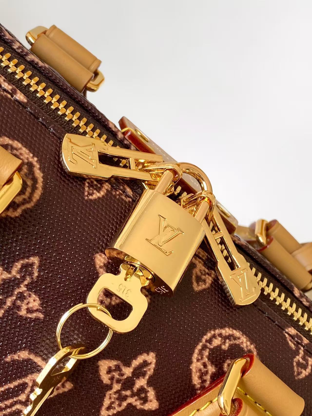 This Speedy Trunk 20 bag is crafted from Monogram Origine canvas to celebrate the 130th anniversary of the Louis Vuitton Monogram pattern. It features smooth cowhide leather on the handles and an exclusive name tag that marks its place in the anniversary collection. The interior reveals striped lining and patch pockets for small items, with a chain and padlock completing the refined details.