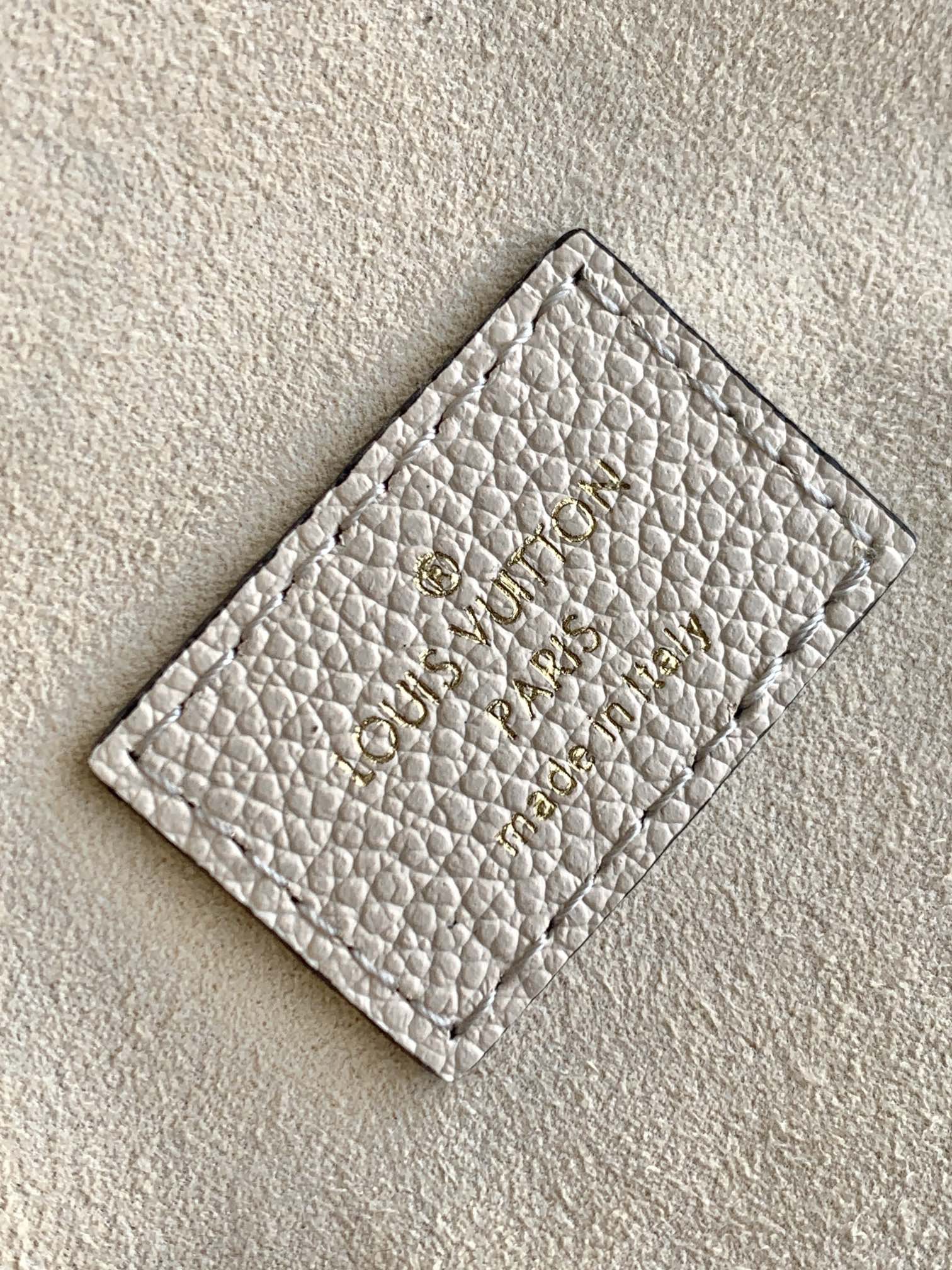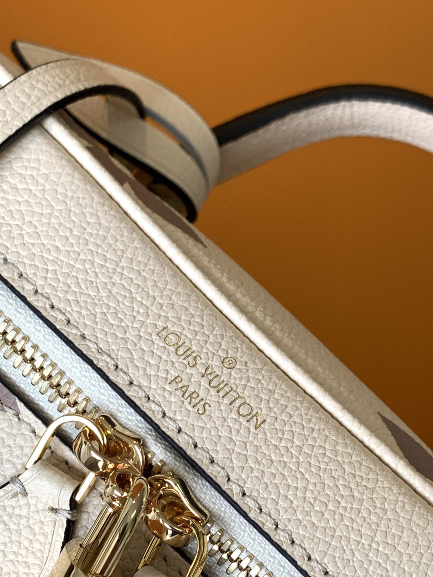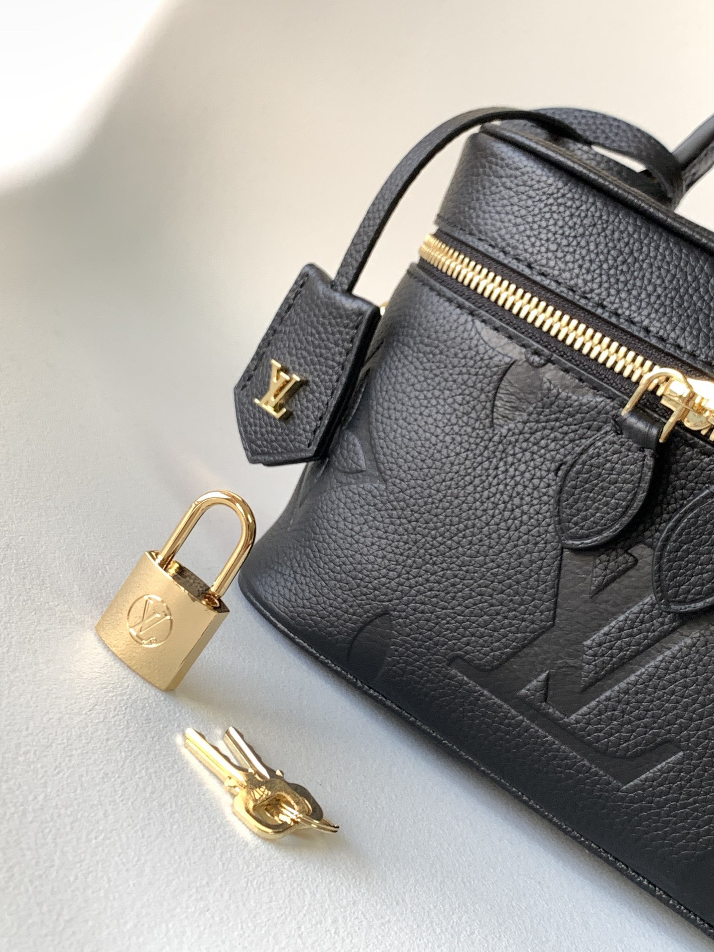 This Vanity PM bag features Giant Monogram embossing, an elegant structure and a top leather handle. The leather tassel allows easy zipper access, while the padlock ensures security. The detachable and adjustable strap includes a woven leather chain.