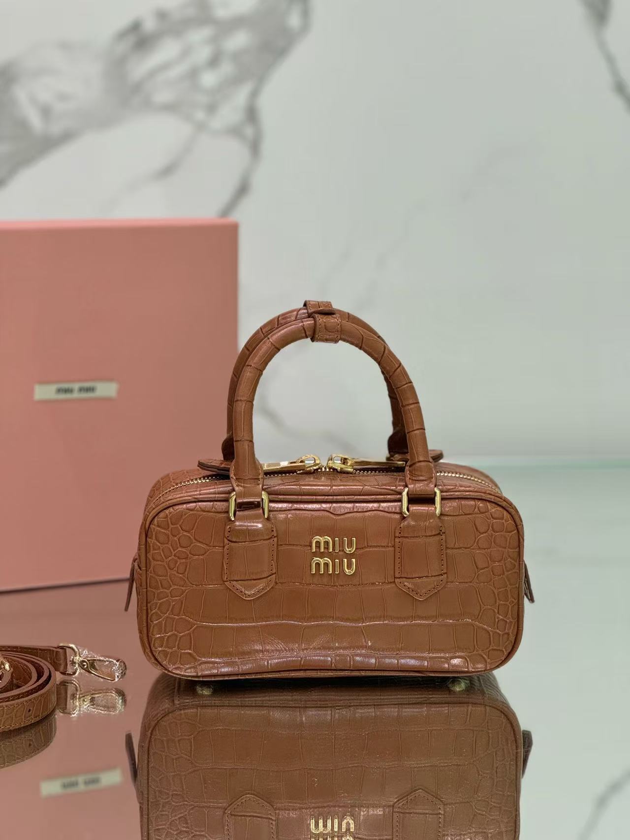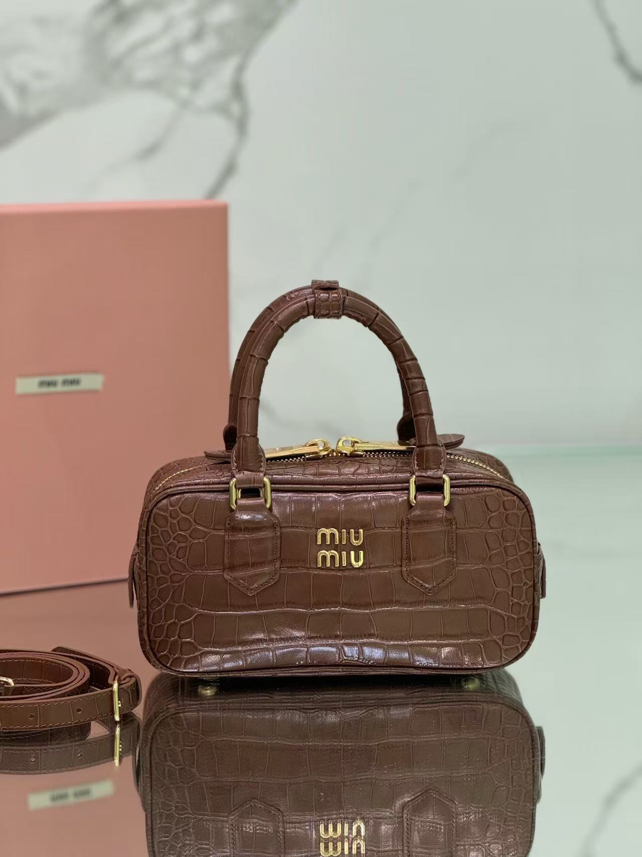 Premium imported calfskin leather, featuring Miu Miu’s distinctive Matelassé pattern. The bag has a refined, structured, and three-dimensional shape.