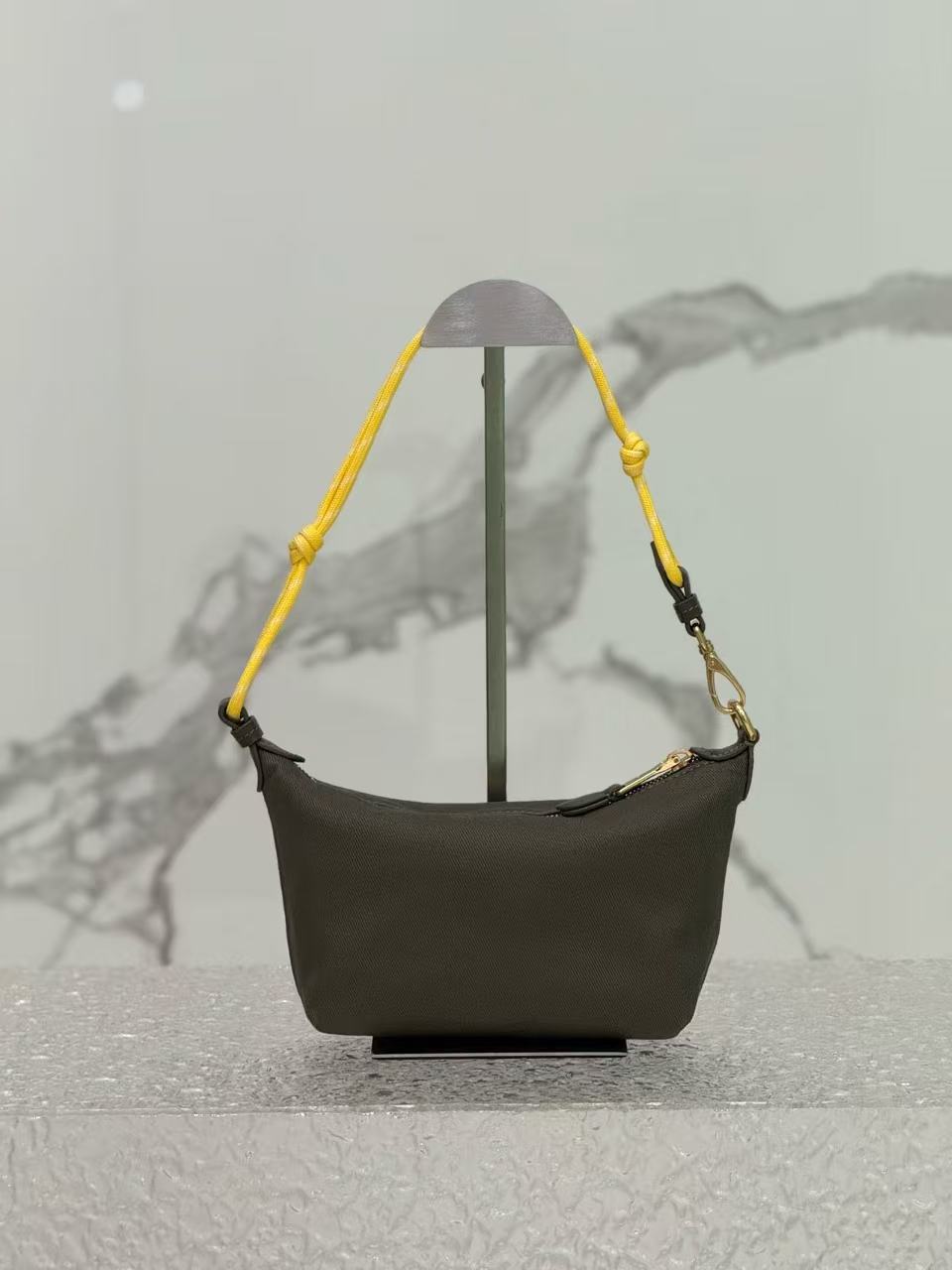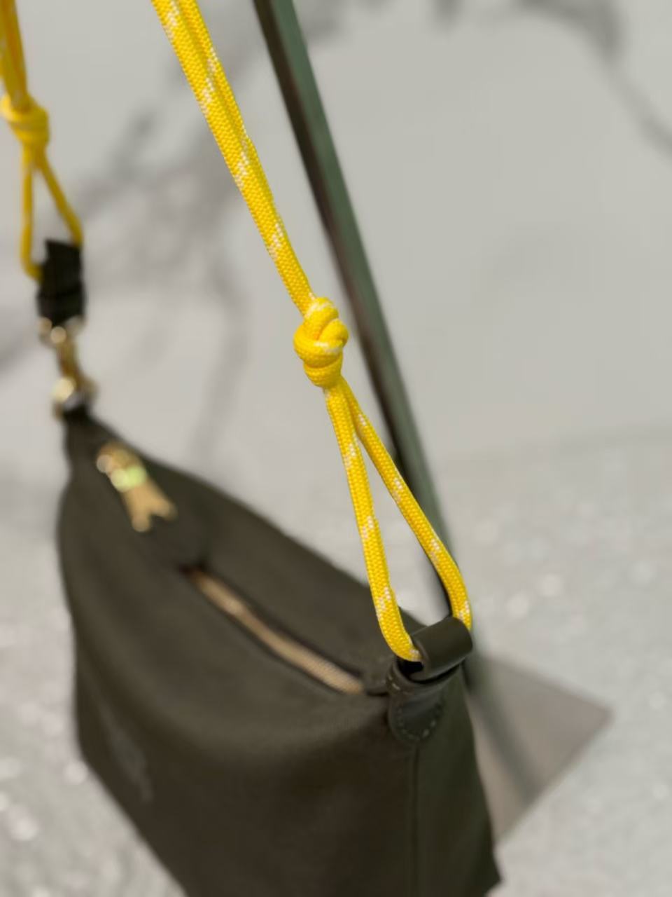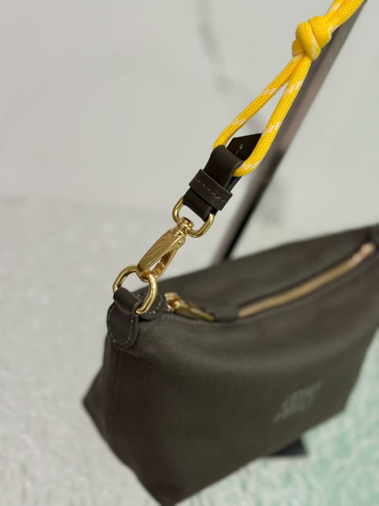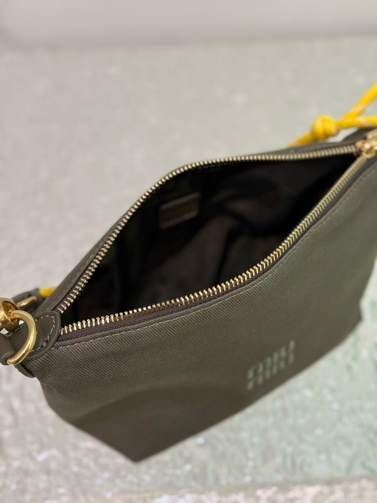 Satin lining,Made of twill water-resistant canvas fabric. Features a signature embroidered micro-logo on the front and a unique woven color wrist strap. Can be carried by hand, worn under the arm, or paired with your own shoulder strap for crossbody wear.