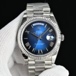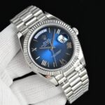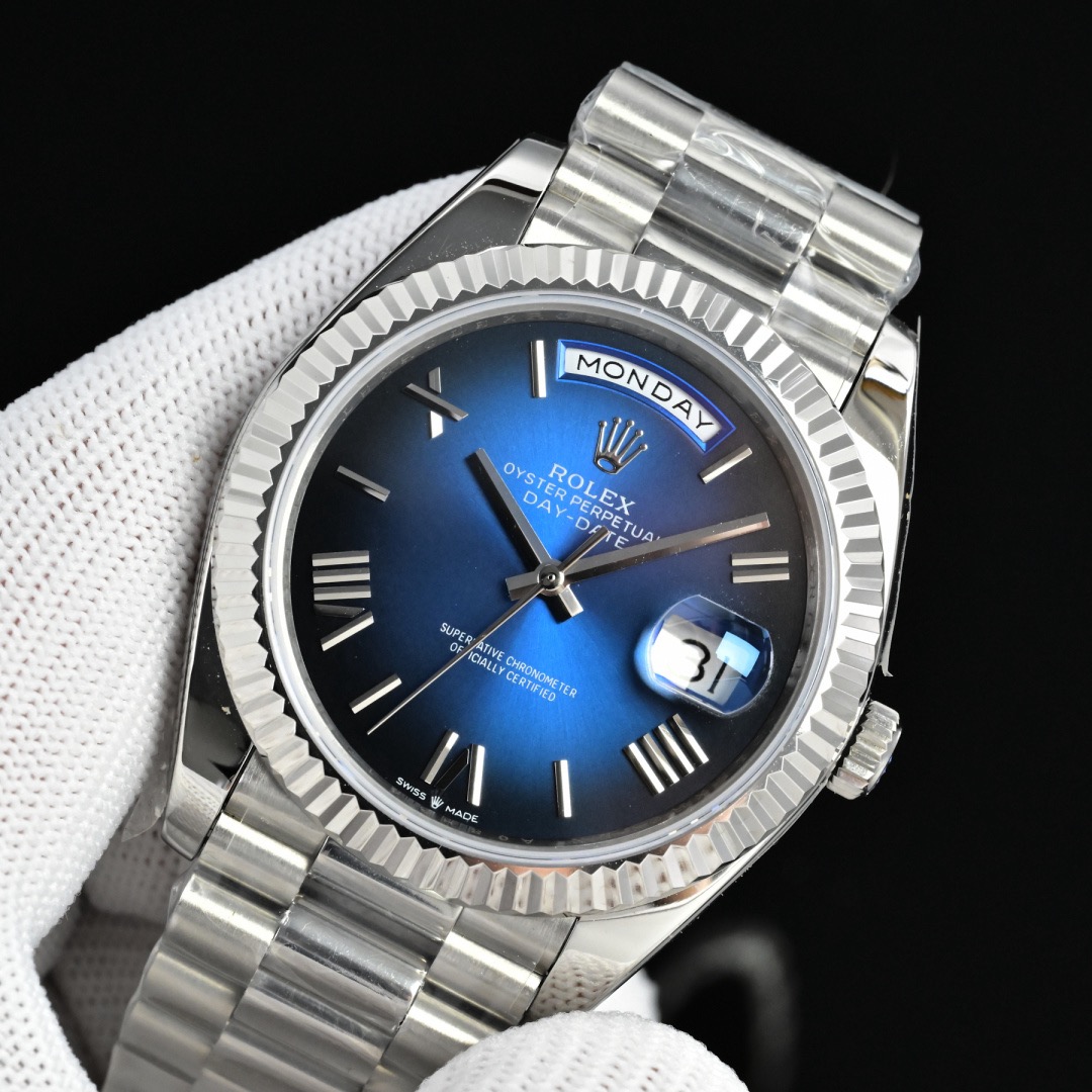 Since its launch in 1956, the Rolex Day-Date (abbreviated as DD) has remained one of the brand’s most iconic flagship models, renowned as the “President’s Watch.” Its most distinctive feature is that it is crafted exclusively from precious metals (such as 18K yellow gold, white gold, Everose gold, or platinum). It was also the first wristwatch to display both the date and the full day of the week simultaneously. The classic 40mm case, paired with a fluted bezel and the President bracelet, exudes an aura of luxury and authority.