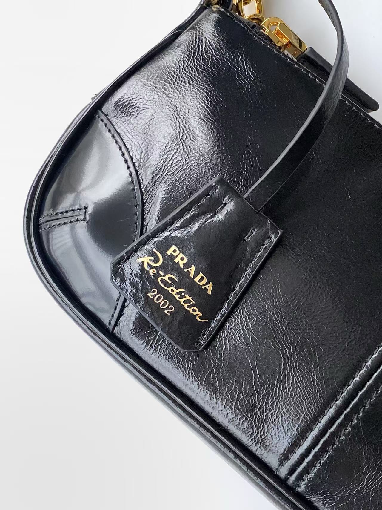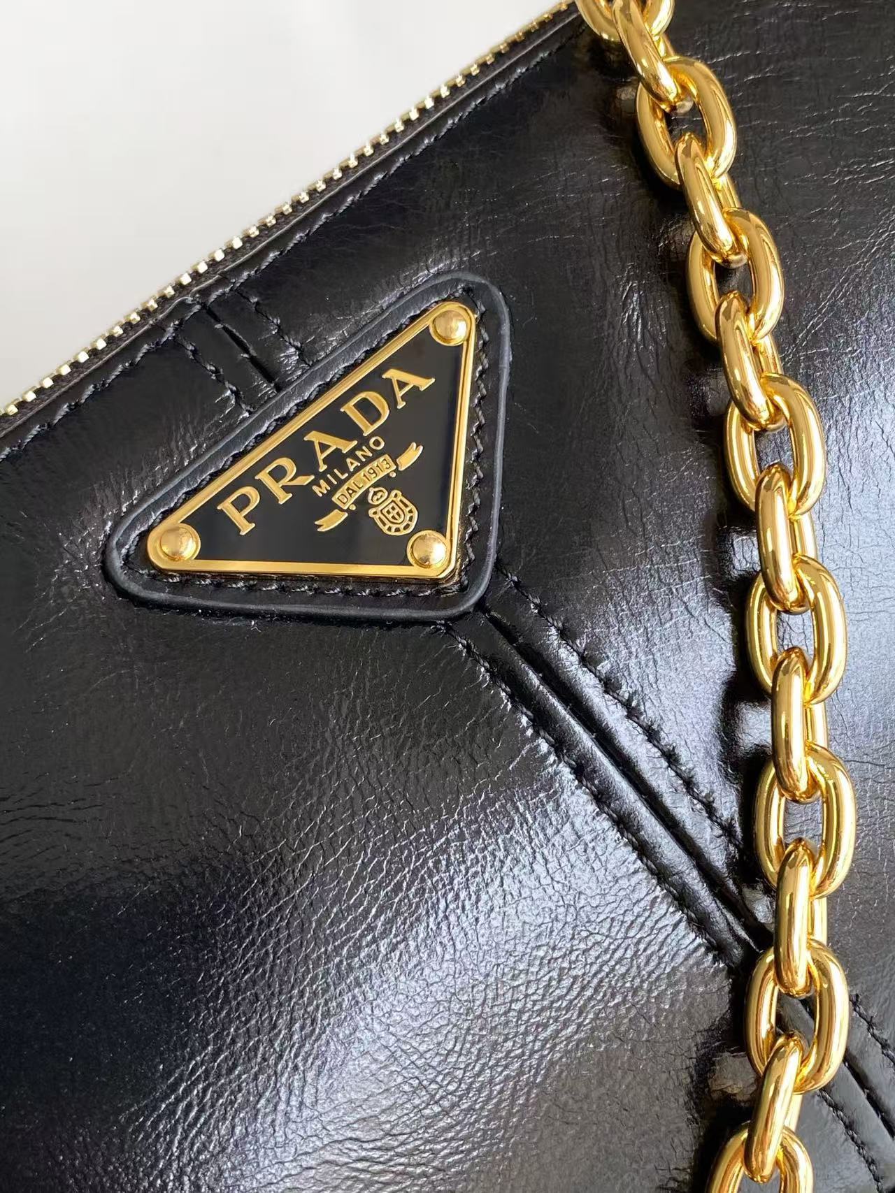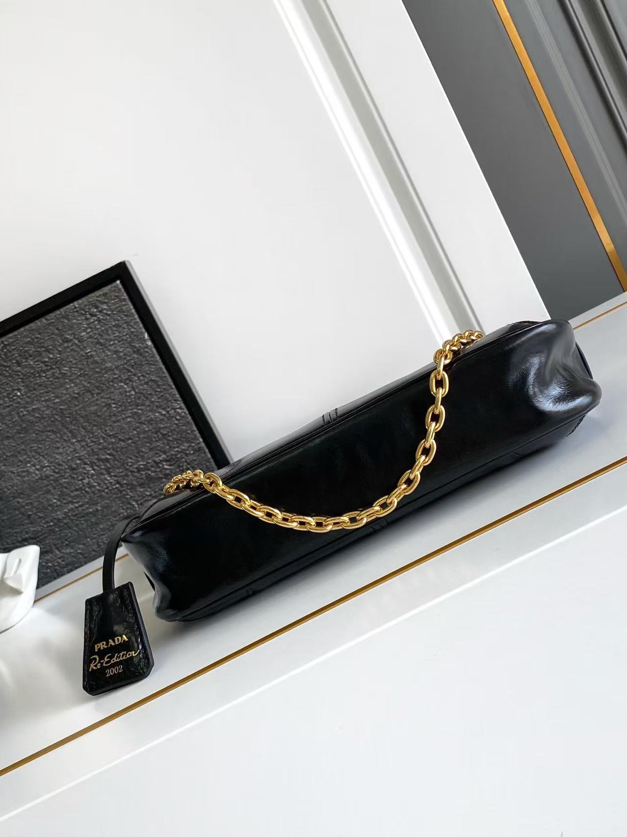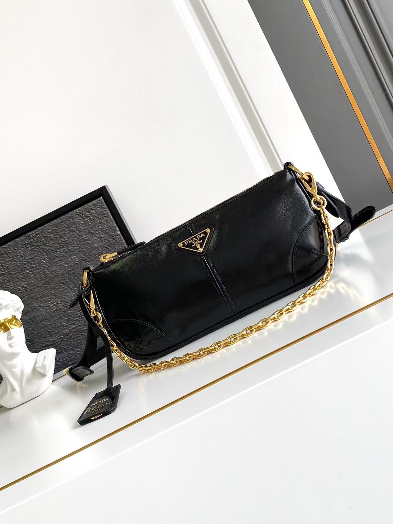 This shoulder bag is a re-edition of a 2002 classic style. A refined and minimalist accessory crafted from leather with a glossy finish. Features an elegant detachable chain handle, perfect for transitioning from day to night. Accented with striking metal hardware, a leather key ring, and an enamel-coated metal triangle logo. Lightweight and practical—grab yours now! 🎉🎉