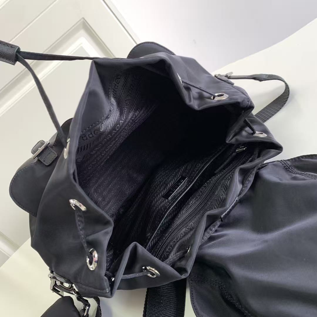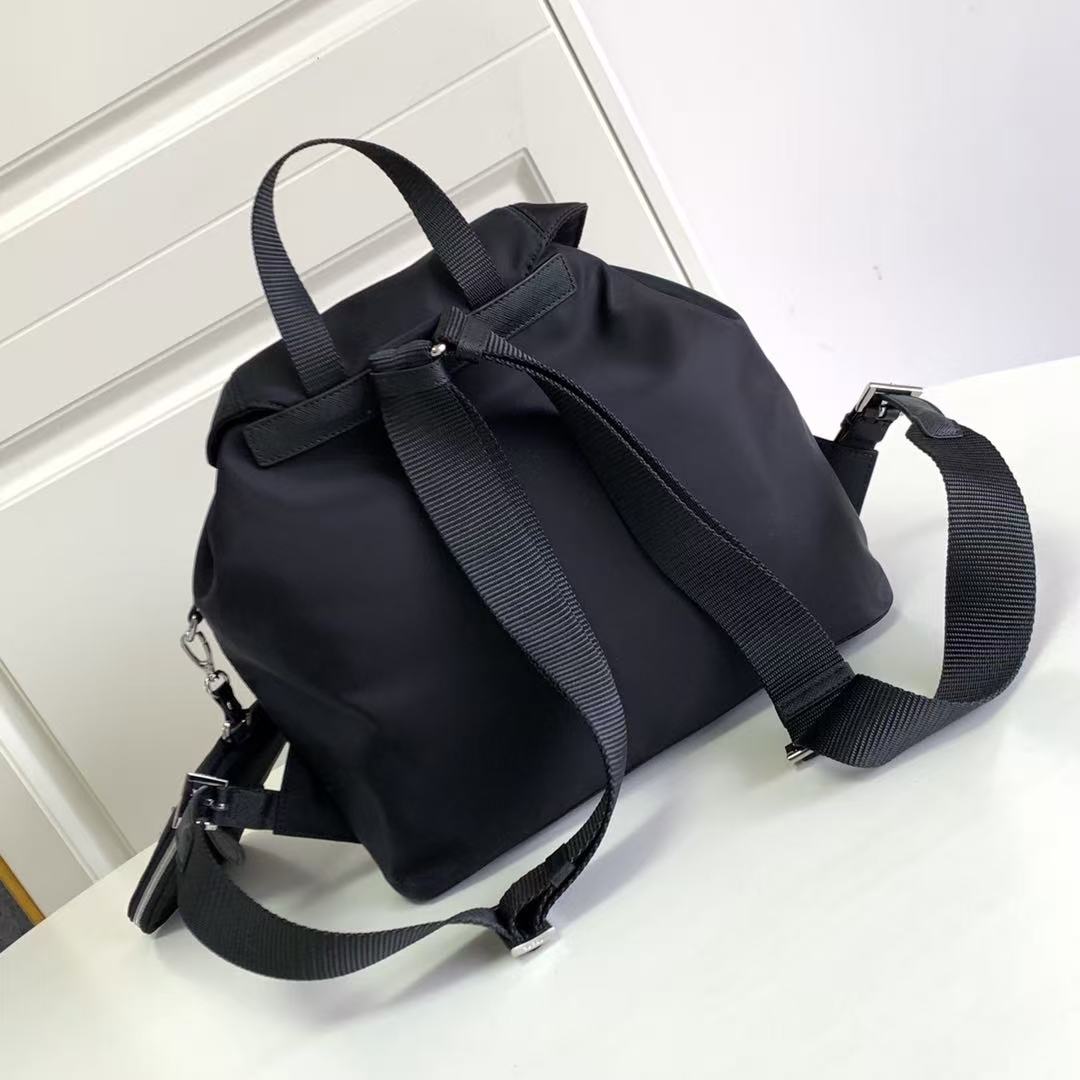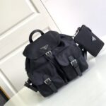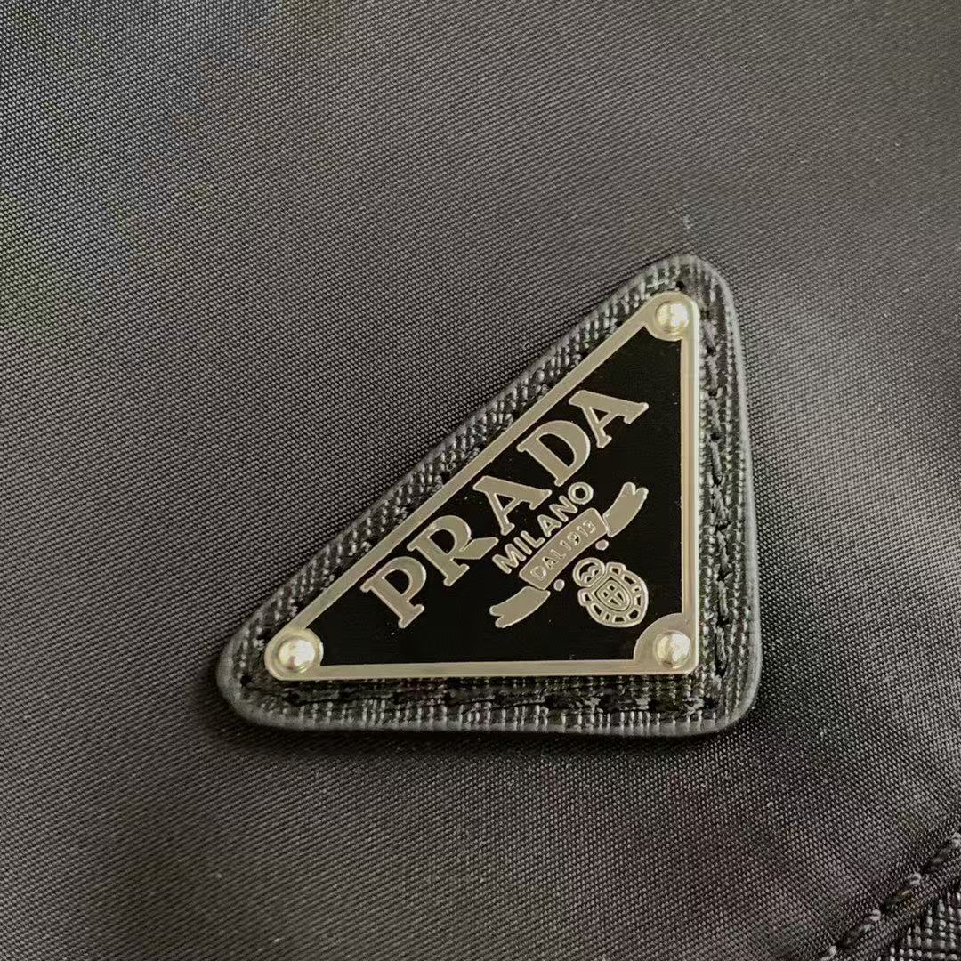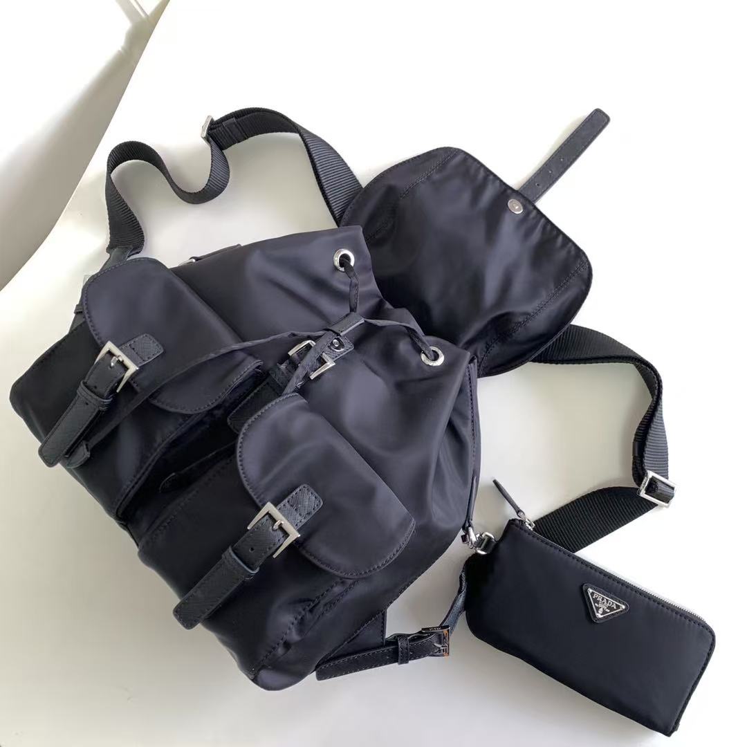 This nylon backpack features exquisite Saffiano leather trim, blending multiple materials for a unique texture. Adorned with the iconic triangle logo, it exudes a fashionable and elegant charm.Also comes with a detachable mini pouch.