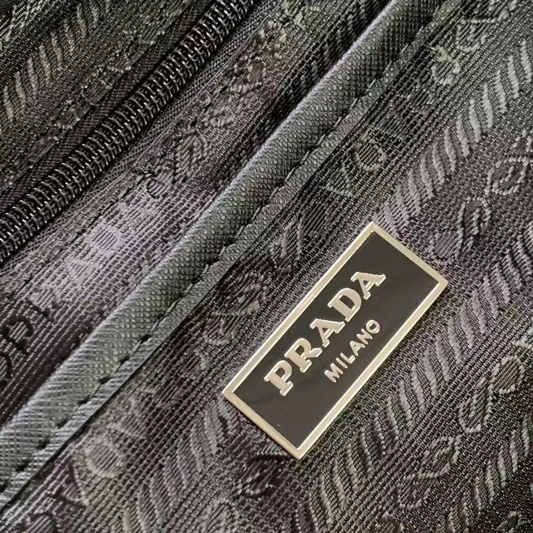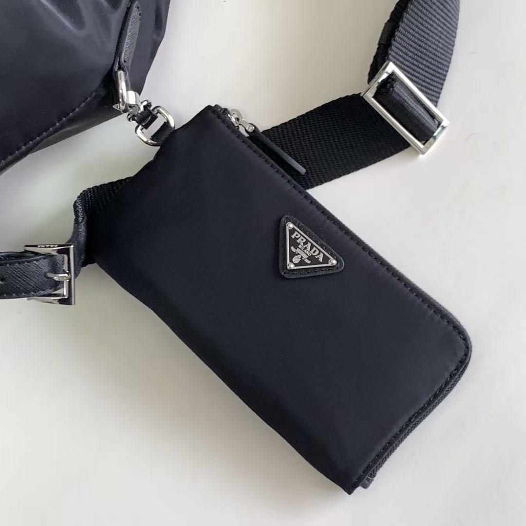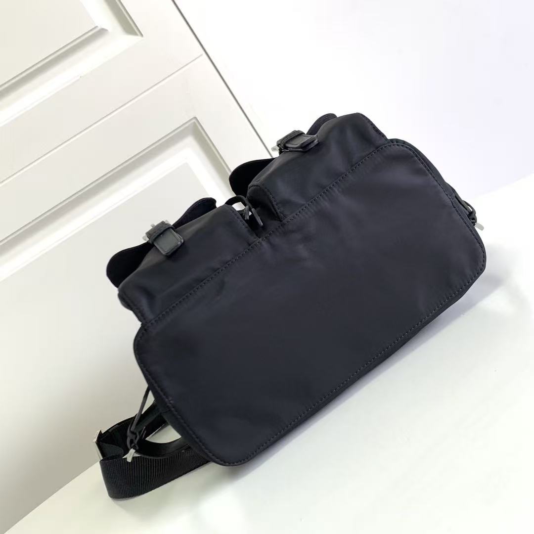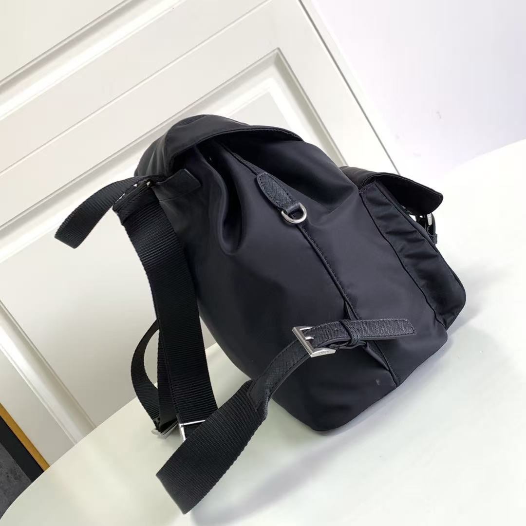 This nylon backpack features exquisite Saffiano leather trim, blending multiple materials for a unique texture. Adorned with the iconic triangle logo, it exudes a fashionable and elegant charm.Also comes with a detachable mini pouch.