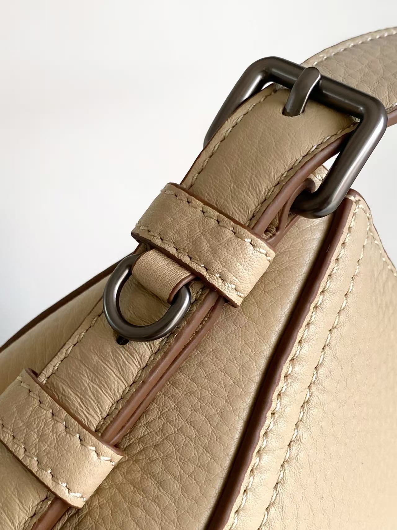 This new interpretation of the iconic Aimée bag celebrates the house’s heritage with a design reminiscent of a travel theme. The distinctive hobo shape adds a new element, as the leather is rich in texture, presenting a fine, irregular grain for a natural and sophisticated effect. The reinforced corners, inspired by travel bags, highlight the craftsmanship and timeless character of this style. Features a detachable key ring/hot-stamped tag. With its spacious capacity, this is another timeless hit 🎉🎉. Ladies, grab it quickly 🎉🎉!