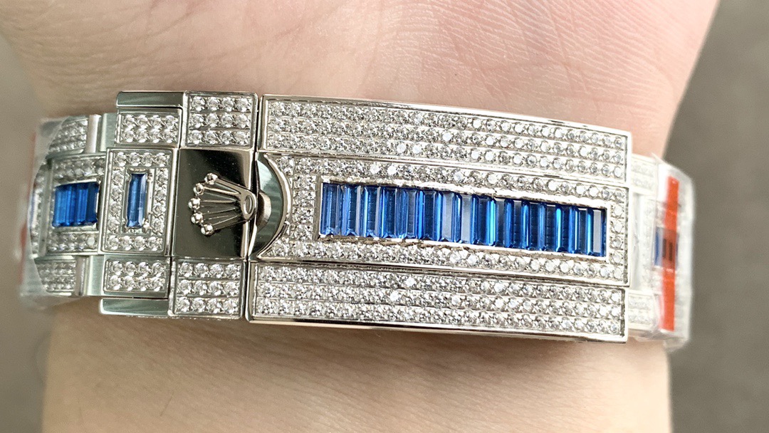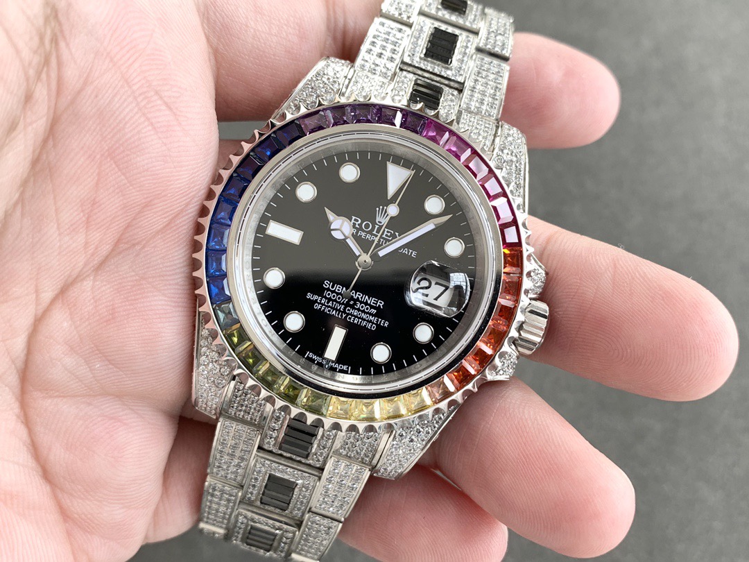 1️⃣ Case】Watch diameter 40mm. Made of top German 904L Oystersteel. Bezel, case and bracelet are fully set with top-grade Swarovski diamonds, restoring the unparalleled luxurious texture of the original.