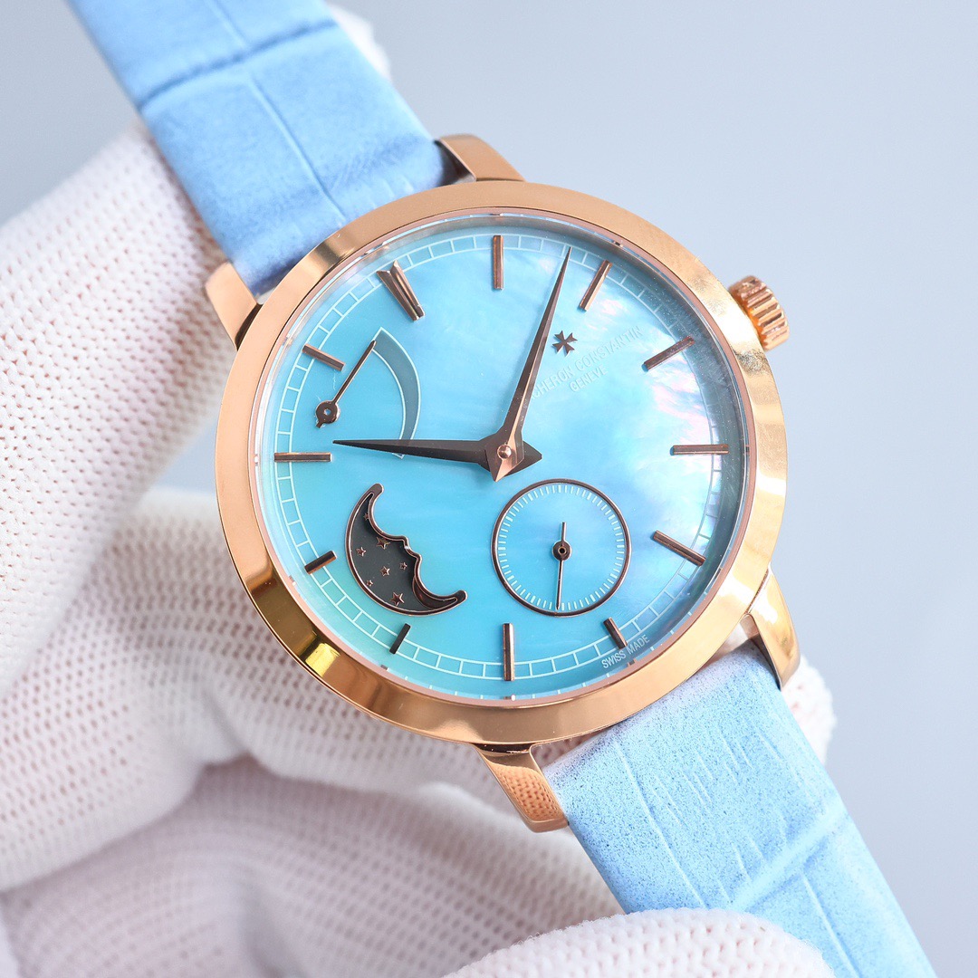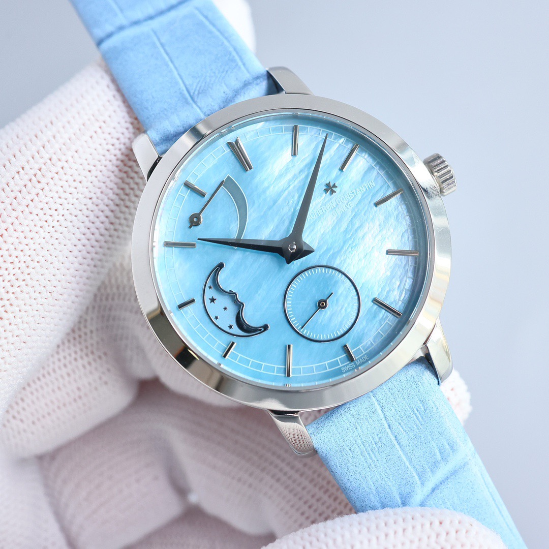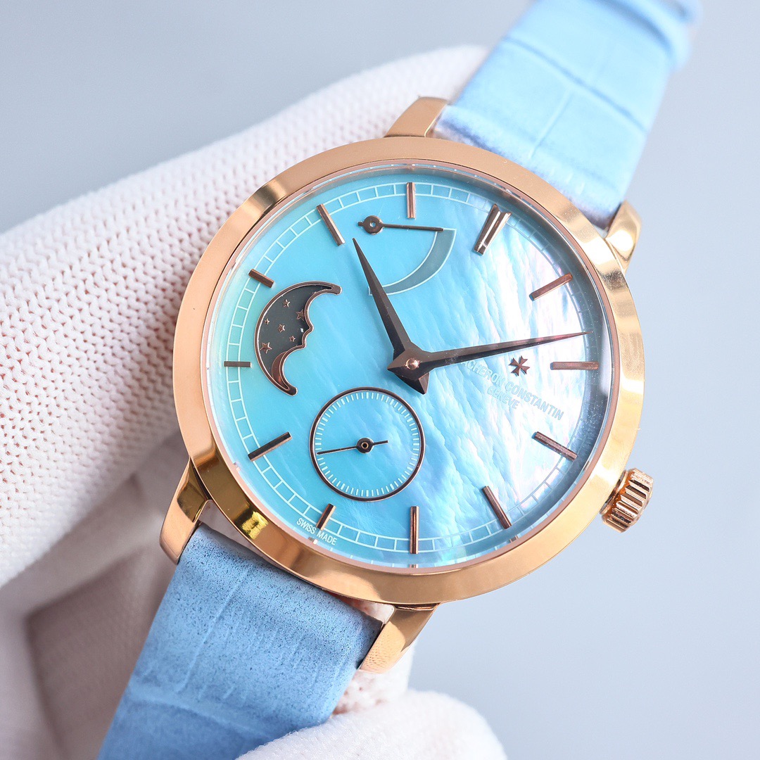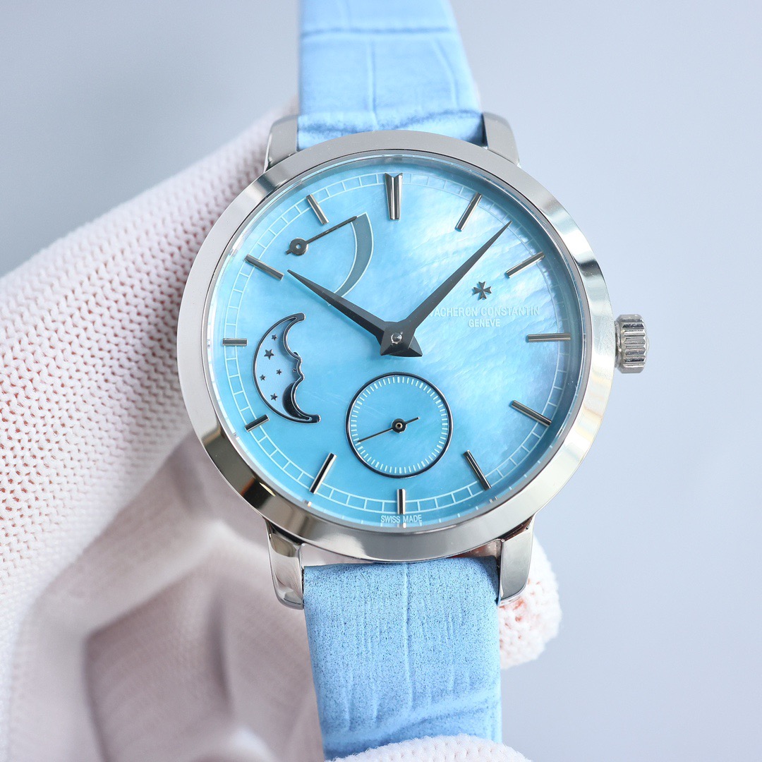 Round white gold case, with the bezel, lugs, and crown set with a total of 81 brilliant-cut diamonds weighing approximately 1.2 carats.Powered by a movement independently developed and manufactured by Vacheron Constantin, with a power reserve of approximately 72 hours, providing ample energy for the hours, minutes, small seconds, and moon phase display functions.